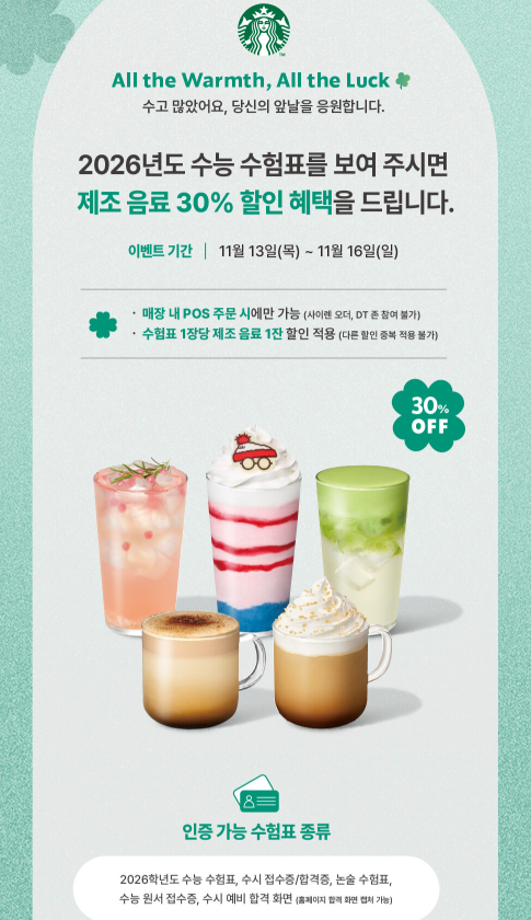 - ☕ 스타벅스 30% 할인 – 전국 적용, 간편함 최고
