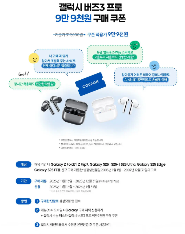 🎁 핵심 혜택 – 갤럭시 버즈3 프로 99,000원!