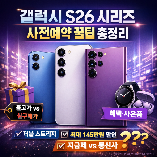 갤럭시 S26 사전예약 혜택과 더블 스토리지, 통신사 지원금, 출고가 대비 실구매가 차이를 2026년 기준으로 정리했습니다. 호갱 피하는 비교 방법까지 확인하세요.