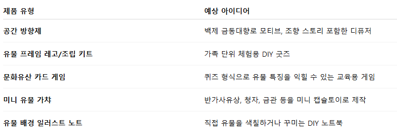 - 예: ‘백제금동대향로’ → 디퓨저로 제작하면서 향기 콘셉트에 불교적 의미 포함