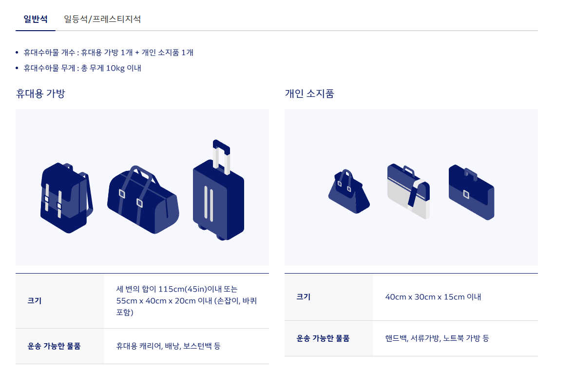 A. 대부분의 항공사는 **기내 반입용 가방 1개 + 개인 소지품 1개(노트북, 핸드백 등)**을 허용해요.