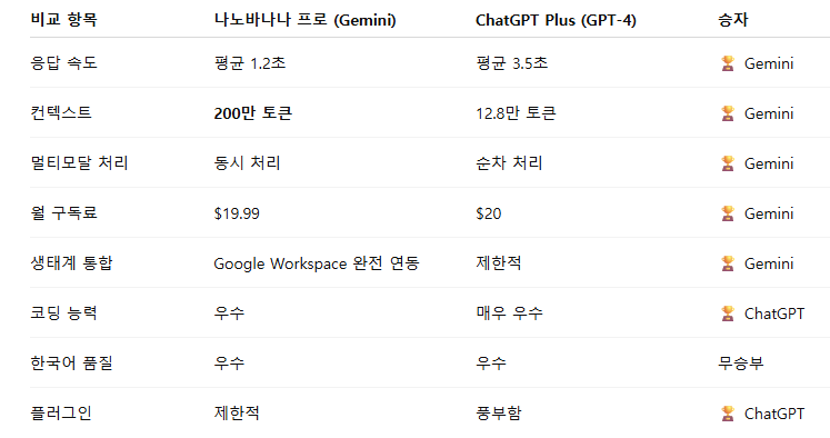 🥊 나노바나나 프로 vs ChatGPT: 성능 비교표