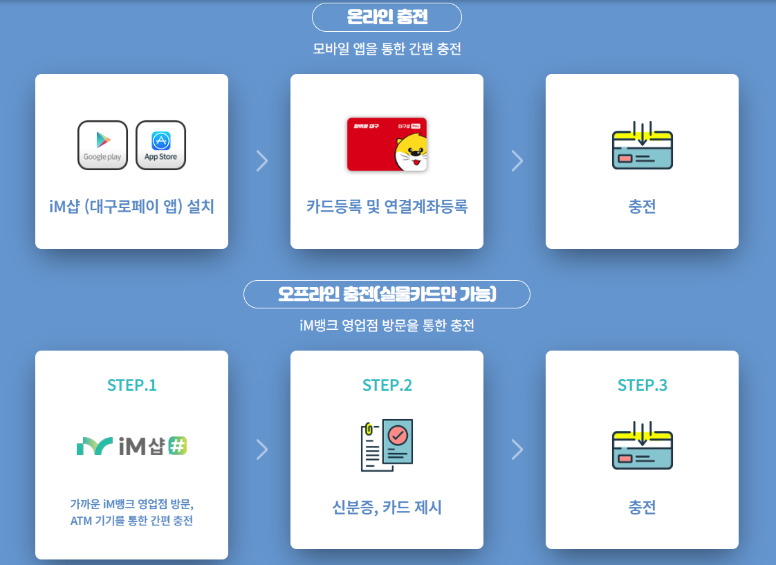 - 은행 충전: 대구은행 영업점에서 현금 충전(실물 카드만)