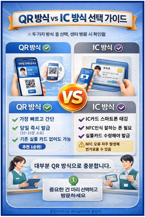 QR 방식은 현장에서 바로 발급, IC 방식은 실물 카드 수령 후 태깅으로 진행됩니다.