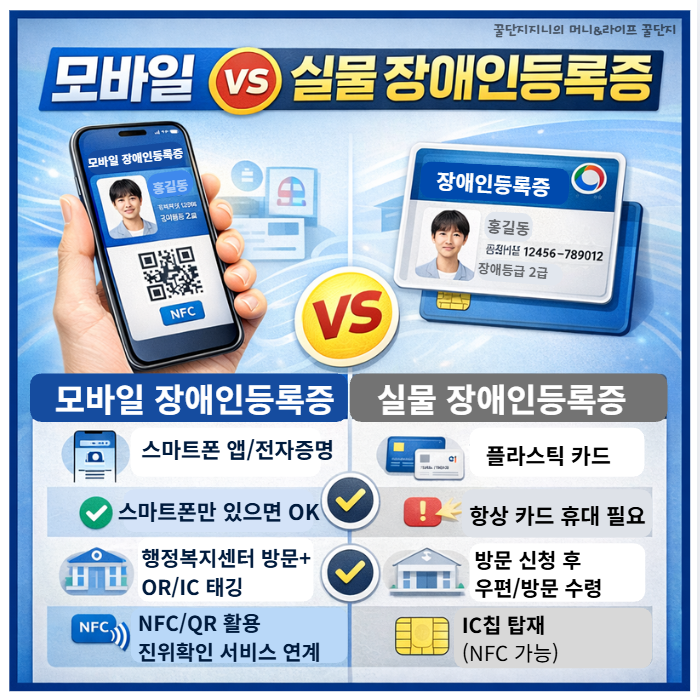 모바일 장애인등록증과 실물 카드의 핵심 차이는 ‘소지 방식’과 ‘편의성’입니다.