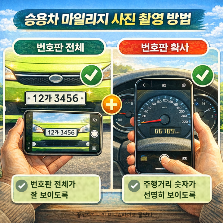 - 계기판 사진 1장 준비(누적 주행거리 선명/전체)