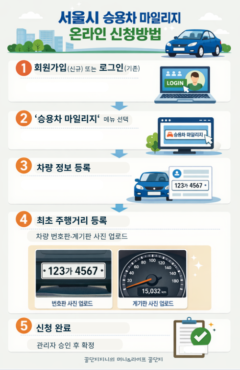 서울시 승용차 마일리지 신청 방법과 필요 서류(사진 2장·신분증), 2026년 모집 기간(2/2~2/27)과 평가 기준(최소 7개월)을 한 번에 정리해 드립니다.