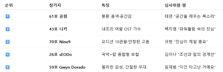 - 태연(소녀시대) – 첫 심사위원 데뷔, “목소리가 지문 같다”는 평가로 화제.
