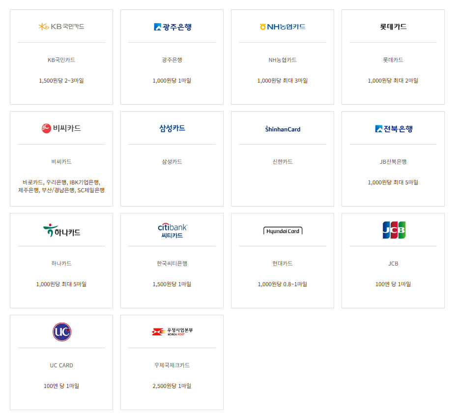 - 예시: 신한카드 20포인트 → 1마일 / 삼성카드 15포인트 → 1마일