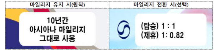 - 전환 비율: 1:1(아시아나 1마일 = 대한항공 1마일)