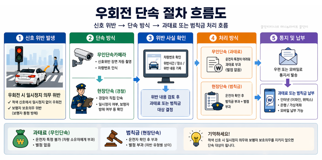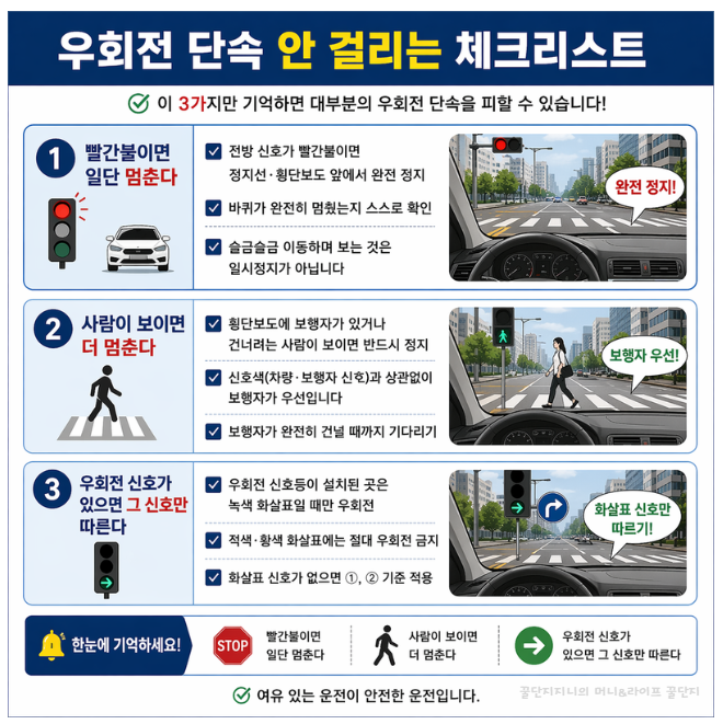 우회전 단속 기준과 우회전 일시정지 방법을 2026년 기준으로 정확히 설명합니다. 신호 상황별 적용법, 과태료 금액, 카메라 위치 확인까지 헷갈리지 않게 바로 적용 가능하게 안내합니다.