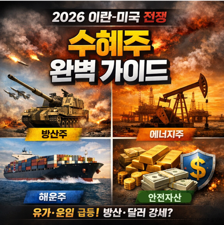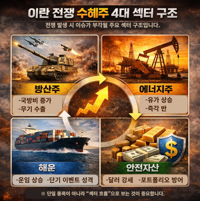 이란 전쟁 수혜주 완벽 가이드. 방산·에너지·해운·안전자산 4개 섹터 핵심 종목과 ETF, 투자 포인트를 정리했습니다. 지금 들어가도 되는지 리스크와 전망까지 확인하세요.