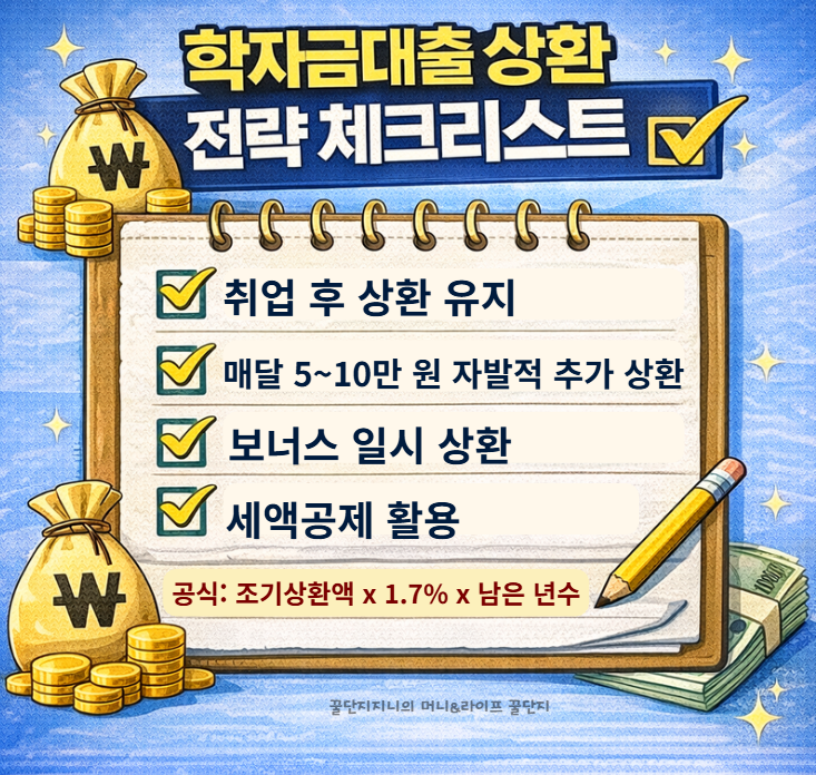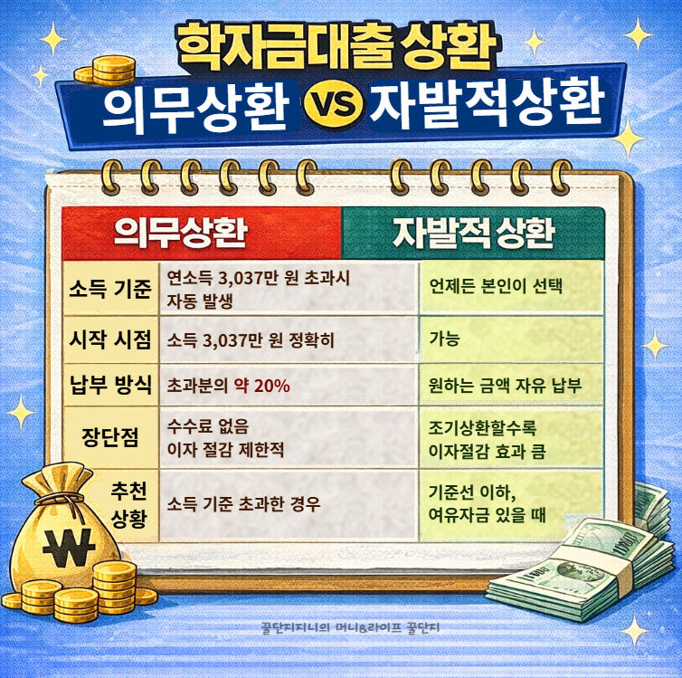 2026년 학자금대출 상환 완벽 가이드. 상환기준소득 3,037만 원 기준 의무상환, 자발적 상환, 유예 조건, 조기상환 이자 절감 계산과 세액공제까지 한 번에 정리했습니다.