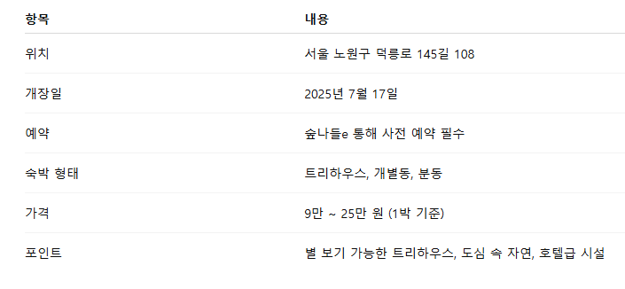 서울 최초 자연휴양림 ‘수락 휴(休)’가 2025년 7월 17일 개장! 트리하우스 숙소부터 불멍존, 산책로까지 완비된 도심 속 힐링 공간을 소개합니다.