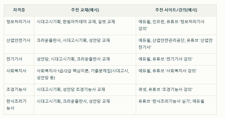 각 자격증의 출제 범위, 시험 방식(필기/실기), 합격 기준을 반드시 확인해요.