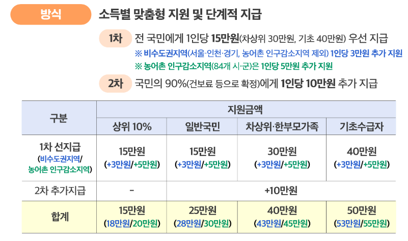 전 국민 대상으로 지역사랑상품권 또는 카드 포인트 형태로 제공되며, 소득 수준에 따라 최대 55만 원까지 지원받을 수 있어요.