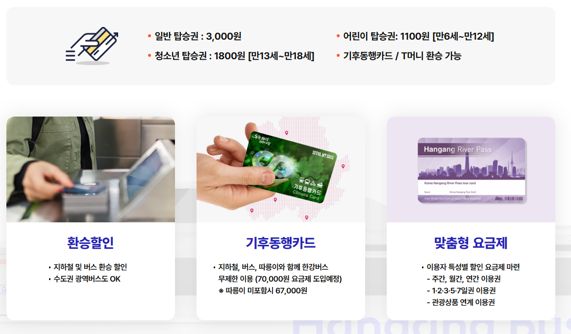 - 할인: 교통카드, 지하철/버스 환승 시 할인 적용