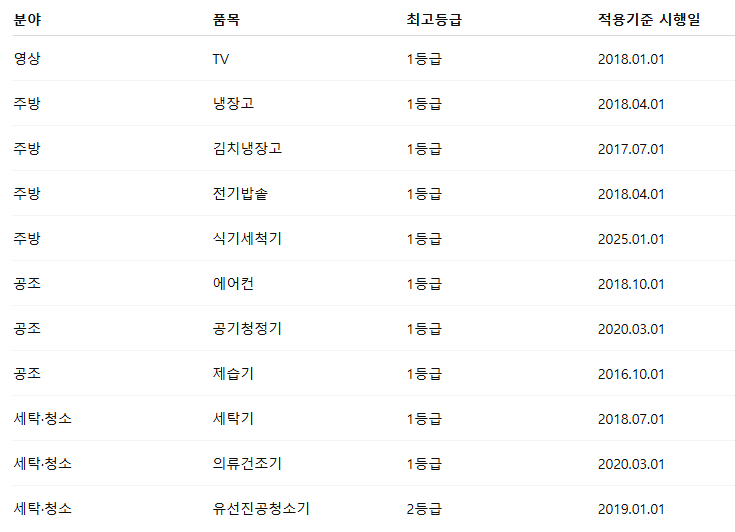효율등급제도에서 관리하는 최상위 등급(1등급 또는 2등급) 제품만 해당됩니다.