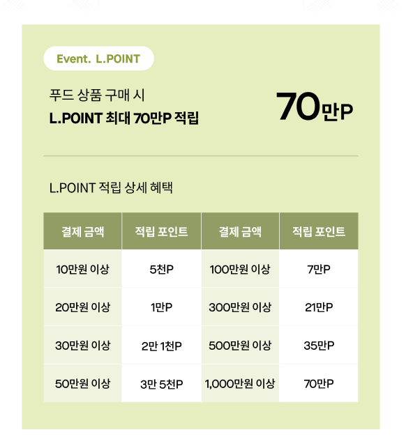 푸드 상품 구매시 L.POINT 최대 70만 POINT 적립되요!