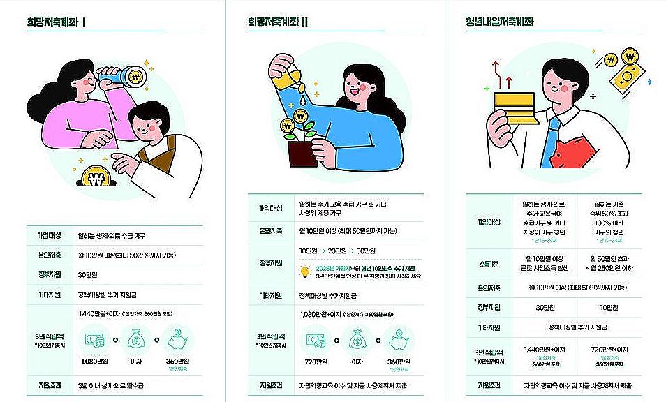 2025년 희망저축계좌 완벽정리! 신청방법, 소득·자산 기준, 유형별 차이, 탈수급 조건, 중도해지 주의사항, 실제 수령액과 꿀팁까지 한눈에 알아보세요.