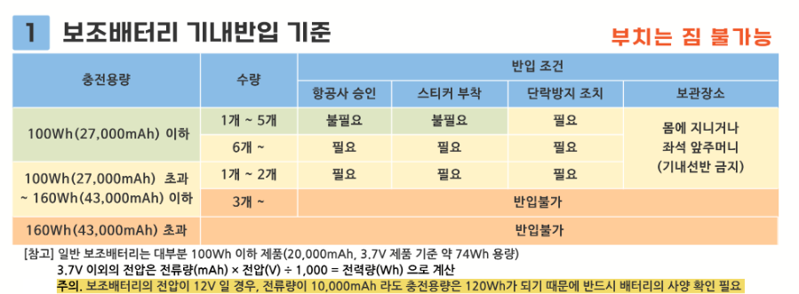 - 기존: 와트시(Wh) 기준으로만 반입 여부 확인 (100Wh 이하 가능, 100~160Wh 일부 가능, 160Wh 이상 금지)
