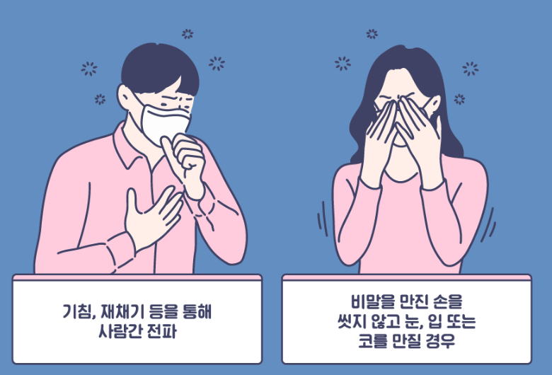 - 오염된 물건을 만진 후 코·입을 만질 때 전파됩니다.