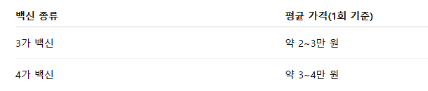 - 접종 비용은 3가 백신 약 2~3만 원, 4가 백신 약 3~4만 원 선