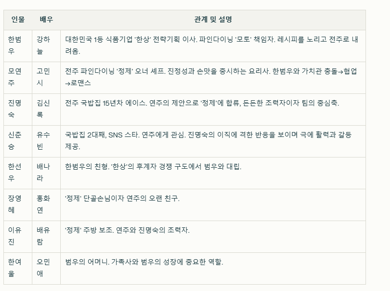 이 드라마는 단순한 요리 드라마가 아니라, 음식이라는 매개체를 통해 사랑, 상처, 성장, 용서 등 인간의 깊은 감정을 섬세하게 풀어냅니다. 두 주인공이 서로 다른 음식 철학과 인생관을 부딪치며 성장하고, 점차 서로를 이해하고 치유하는 과정이 따뜻하게 그려져요.