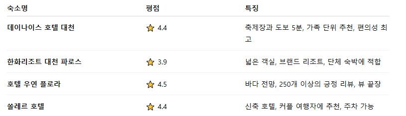 숙소에서 축제장까지 걸어 다닐 수 있는 거리에 있는 데이나이스호텔, 한화리조트, 우연플로라 등이 인기가 높아요.