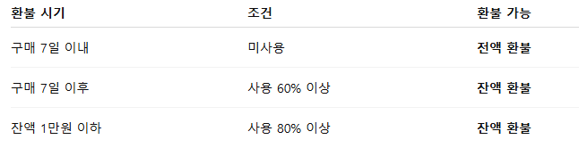 - 구매 후 7일 경과 + 사용률 60% 미만이면 환불 불가