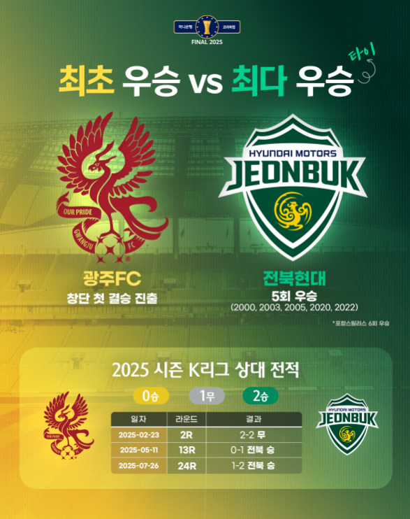 광주는 창단 첫 결승이라는 ‘동화 같은 스토리’를 완성하려 하고, 전북은 ‘최다 우승 13회’라는 대기록에 손을 뻗고 있어요.