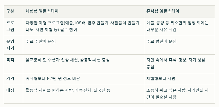 - 체험형: 명상, 참선, 108배, 연등 만들기 등 사찰 프로그램 포함