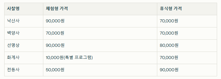 - 휴식형: 풀수 일정(예불,공양 등) 외에는 재부분 자유 시간 위주, 선택적으로 체험 가능