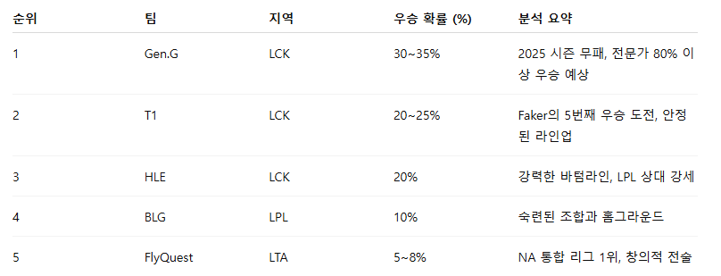 - LCK (한국): Gen.G, HLE, KT Rolster, T1