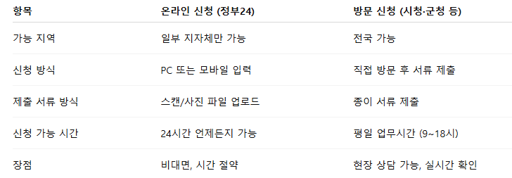 • 일부 지자체는 정부24 온라인 신청 가능
