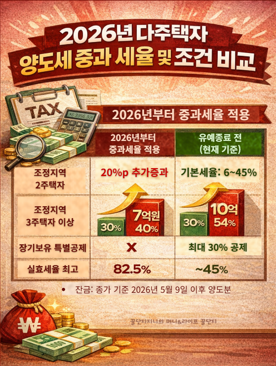 2026년 다주택 양도세 중과 부활이 확정됐습니다. 유예 종료 전 절세 조건, 세금 폭등 기준, 2주택자·3주택자별 전략을 지금 확인하세요.