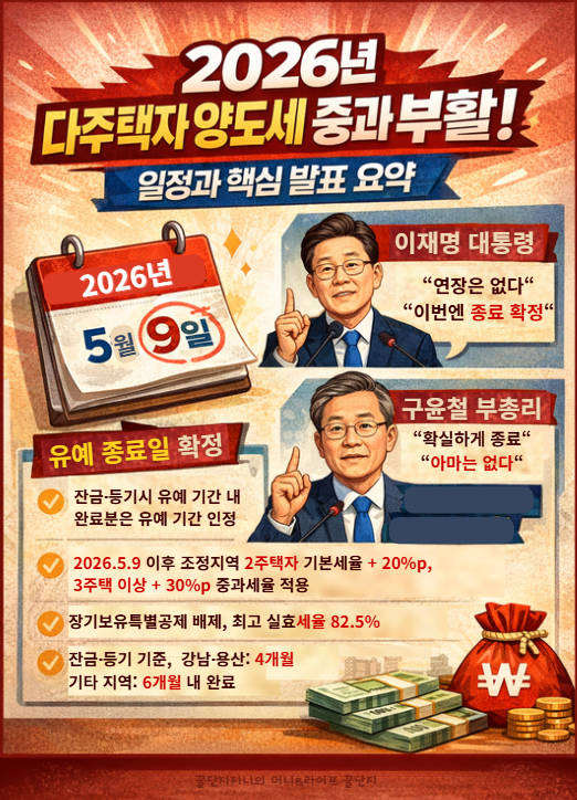 다주택 양도세 중과 유예는 2026년 5월 9일을 끝으로 종료됩니다. 이는 단순한 연장이 아닌, 정부 차원의 확정 발표로 부활이 기정사실화된 상태입니다.