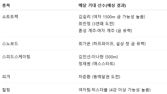 📈 올림픽 때마다 쇼트트랙 성적이 전체 순위에 큰 영향을 미쳤어요. 이번 대회도 핵심은 쇼트트랙 + 설상에서의 확장입니다.