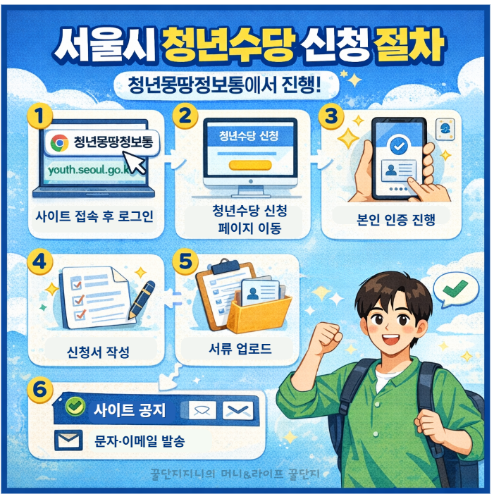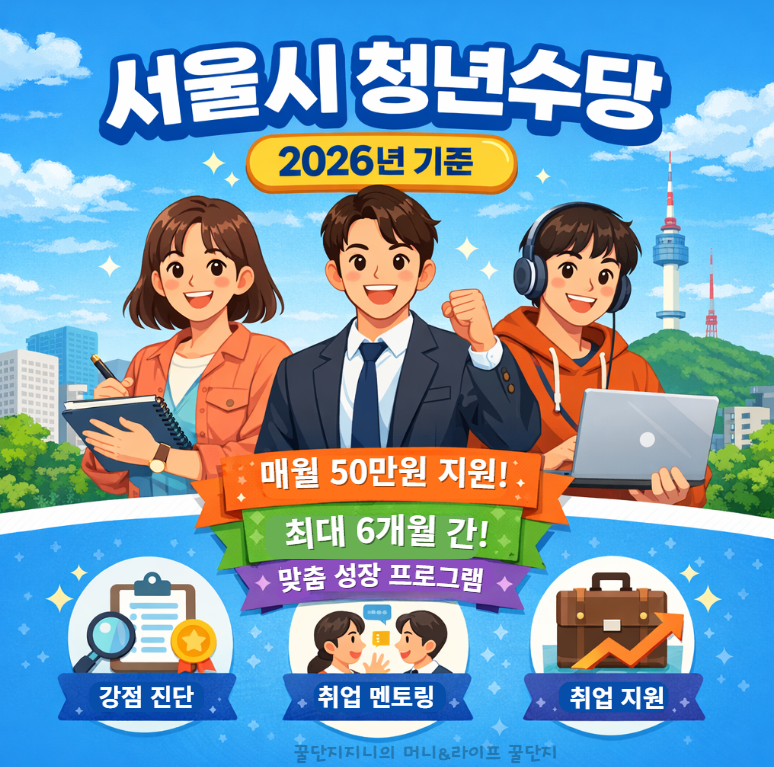 서울시 청년수당 2026년 기준 신청 조건, 월 50만원 지급 기준, 신청 방법과 사용처까지 정리했습니다. 서울 청년 지원금 대상 여부와 실제 신청 절차를 확인해 지금 바로 신청 준비하세요.