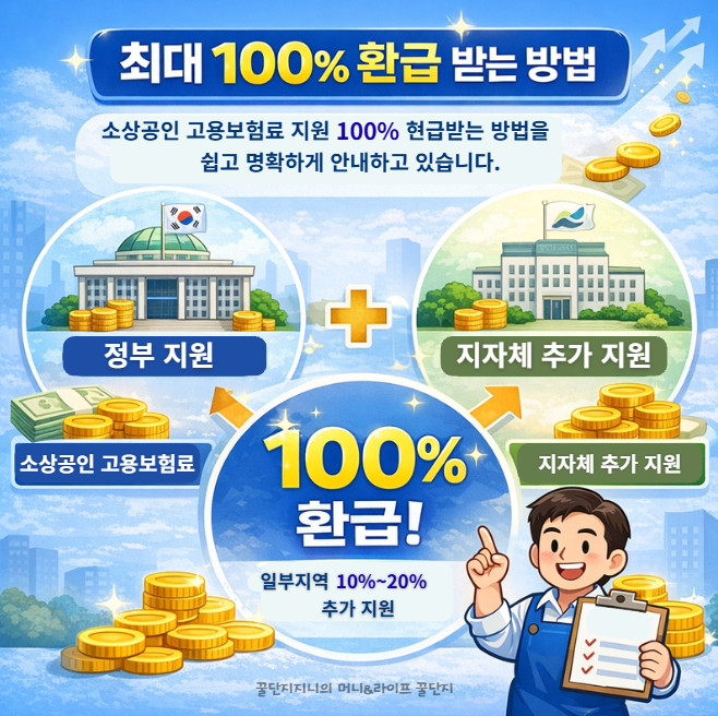 2026 소상공인 고용보험료 지원 대상, 환급 비율, 최대 100% 가능 여부와 신청 방법까지 한 번에 정리했습니다. 신청 전 꼭 확인해야 할 핵심 정보를 확인하세요.
