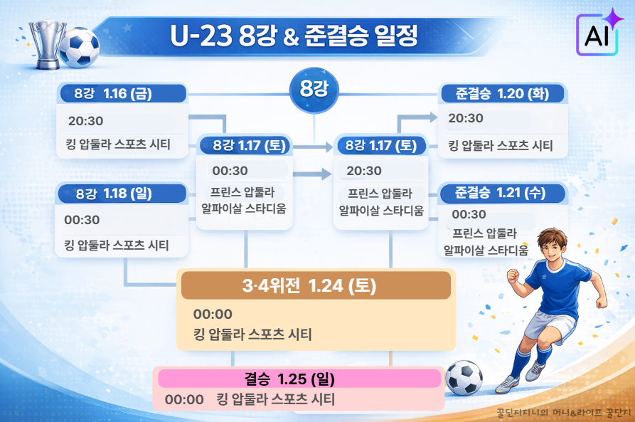 2026 아시안컵 U-23 완전정리! 대회 일정, 한국 경기, 대표팀 명단, 중계 채널, 8강 대진표, 우승 시나리오까지 한눈에 확인하세요.