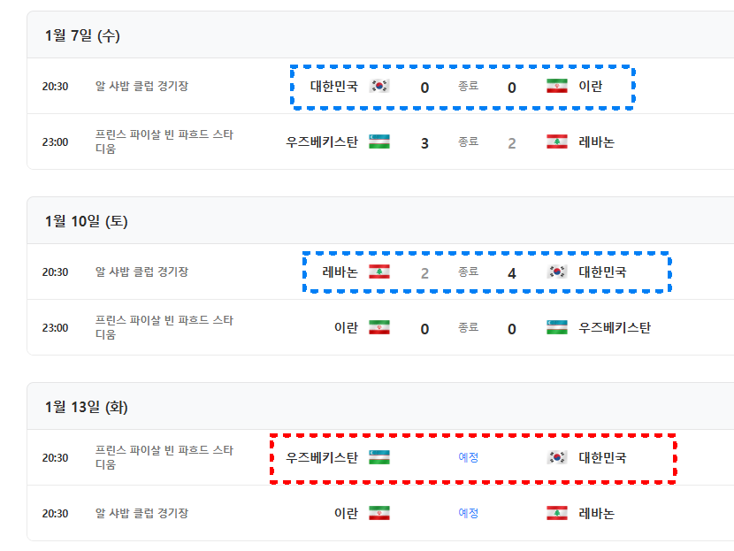 • 3차전: 1월 13일 (화) 오후 8:30 vs 우즈베키스탄 – 예정