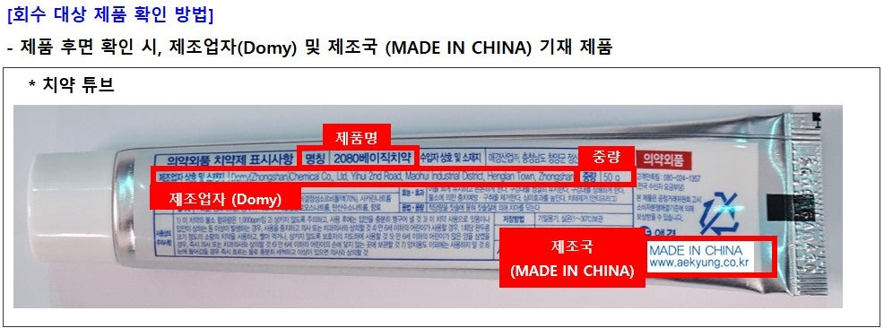 - 2080치약 중국산 6종, 트리클로산 검출로 전량 리콜 중