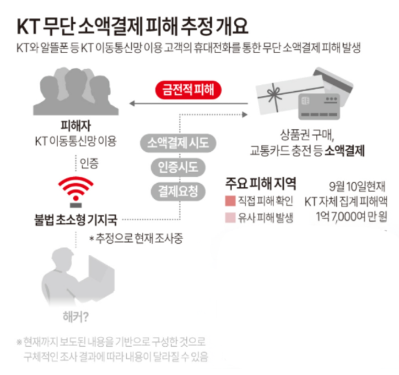 - 공격자는 불법 초소형 기지국(펨토셀 또는 IMSI 캐처)를 설치해 KT 고객의 IMSI 정보를 탈취했습니다.